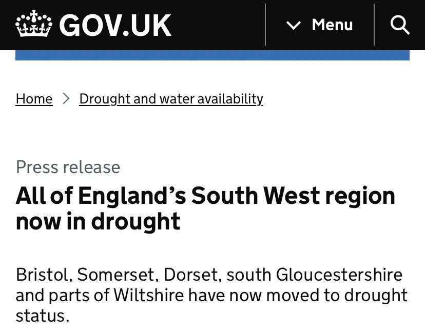 干旱范围包括布里斯托Bristol、Somerset、south Gloucestershire、Dorset和Wiltshire的部分地区。