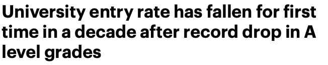 据《每日邮报》(Daily Mail)报道,在A-level考试成绩出现创纪录下降后,英国大学入学率十年来首次出现下降。