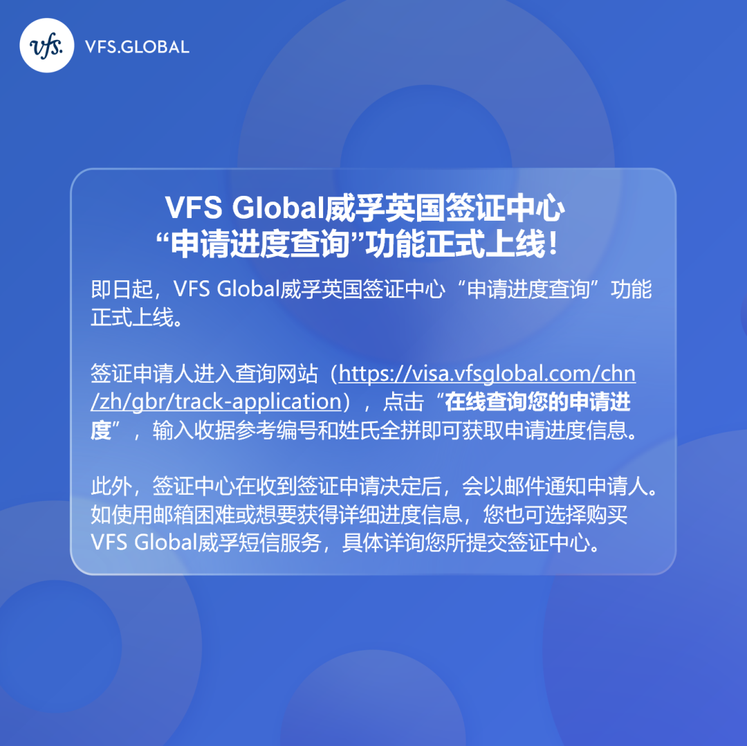 即日起,威孚VFS Global英国签证中心开放“申请进度查询”,向所有英国签证申请者免费开放。