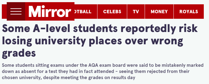 据MailOnline报道,可能有高达4,000名学生在A-level考试中被错误地标记为“缺席”,而他们实际上参加了考试。