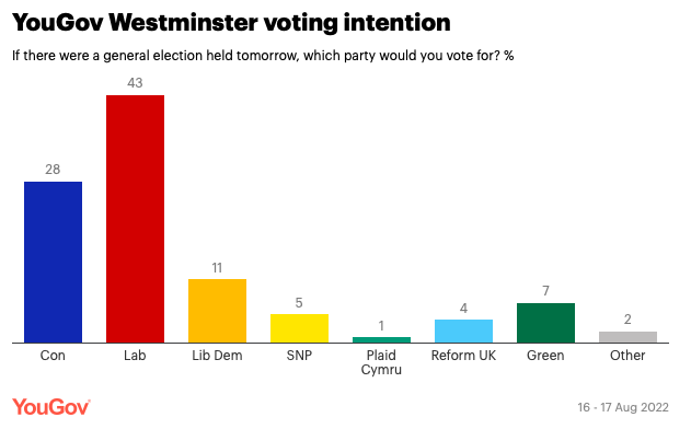 最新的YouGov投票意向调查显示,保守党支持率为31%(比8月16-17日的上一次调查+3%),工党为39%(-4%)。