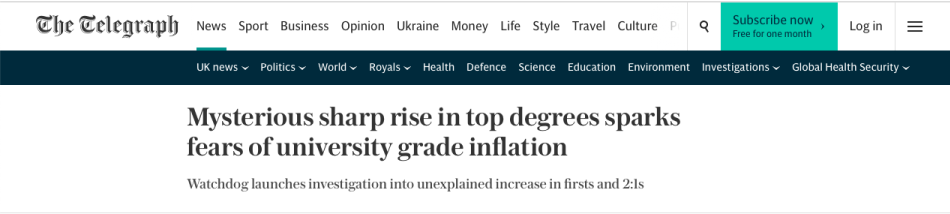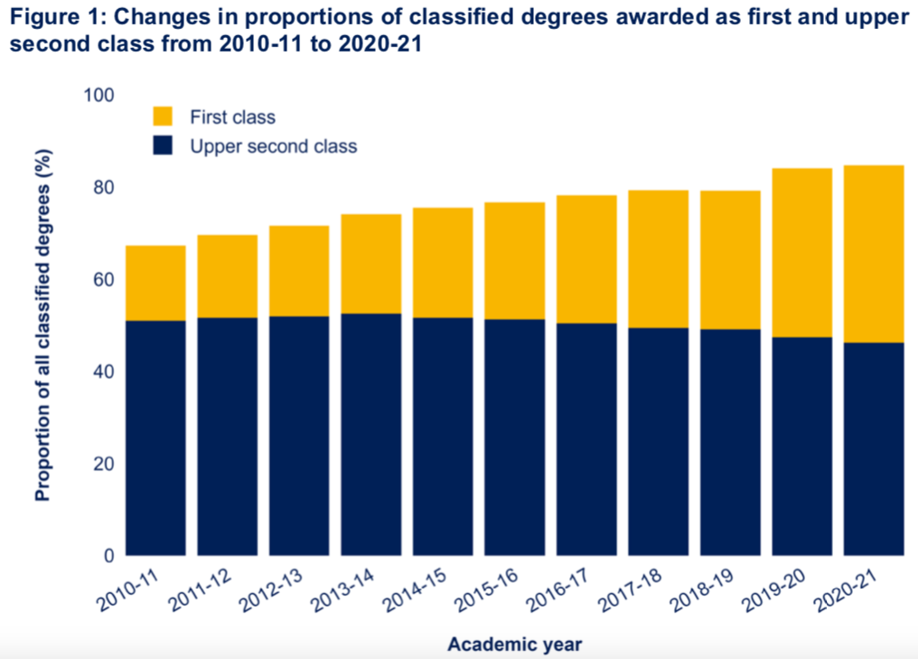 OfS在今年早些时候获得了调查学生成绩学位膨胀的新权力,并引入了新的监管条件,要求大学“有效且准确地评估学生,颁发可信的、经得起时间考验的学位证书”。