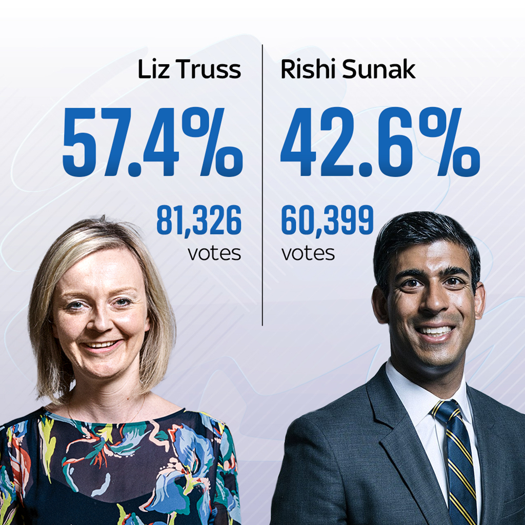 在最后的保守党票选中,Liz Truss获得81,326票,Rishi Sunak获得60,399票,以57.4%的票数取得了决定性的胜利。