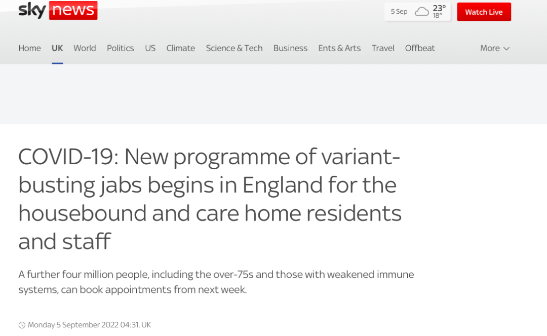 从9月5日开始,英格兰的护理院居民及其工作人员将成为世界上第一批,接种针对原新冠毒株和Omicron变种的新二价疫苗的人群之一。