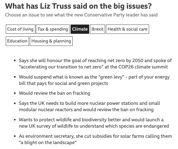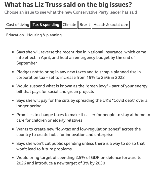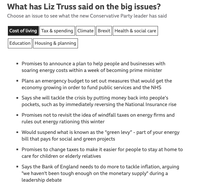 Liz Truss承诺当选首相后一周内宣布一项计划,帮助个人和企业解决飞涨的能源成本问题。其中包括制定紧急预算、暂停收取“绿色税”,以及对英国能源市场的供应进行改革和提供定向支持等。不过具体方案没有任何透露。