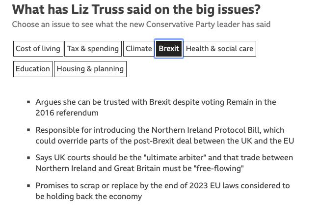 与欧盟谈判的持续僵局意味着Liz Truss必须决定是否放弃北爱尔兰议定书,以试图解决爱尔兰边境的海关问题。