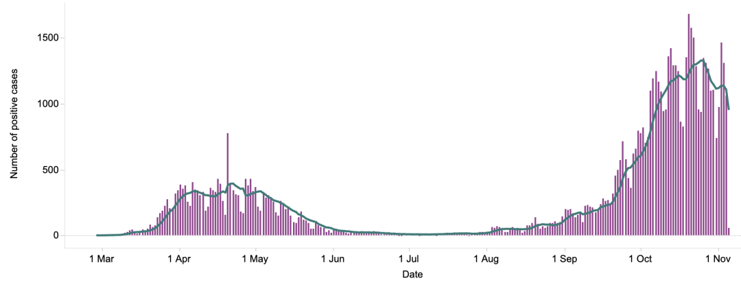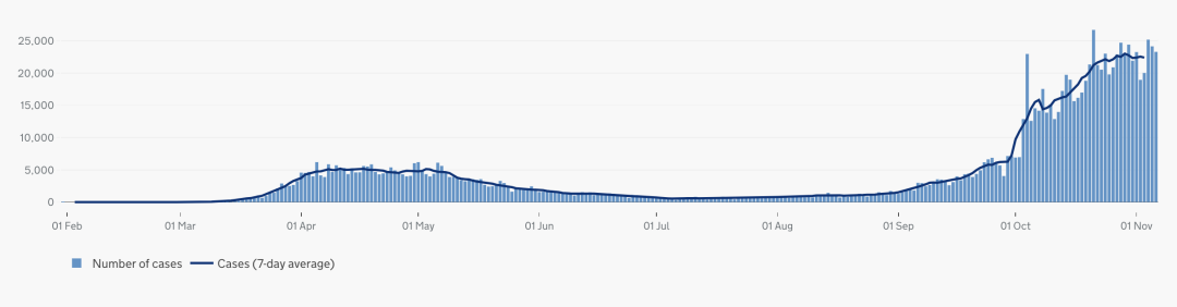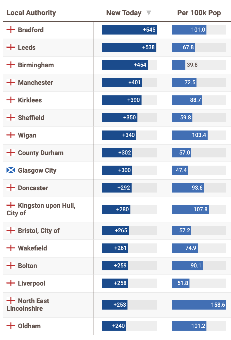 11月5日(周四),新增确诊数量最多的城市为利兹(+538)。