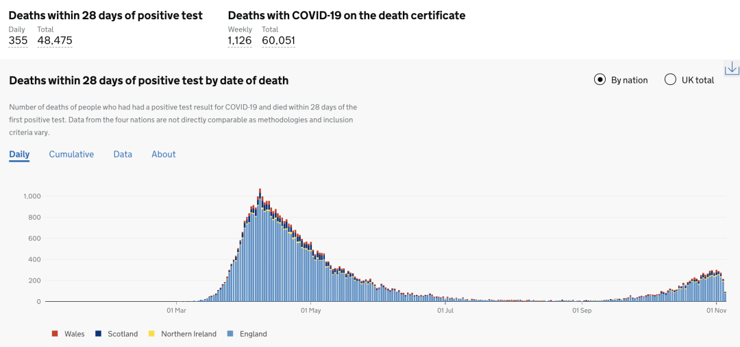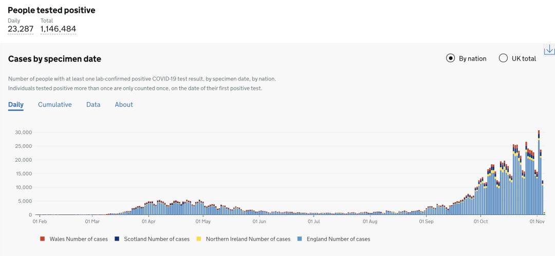 截止至2020年11月6日(周五)英国时间09:00,累计检测结果量32,970,188次(+344,045);累计确诊1,146,484例(+23,287);累计病亡48,475例(+355)。