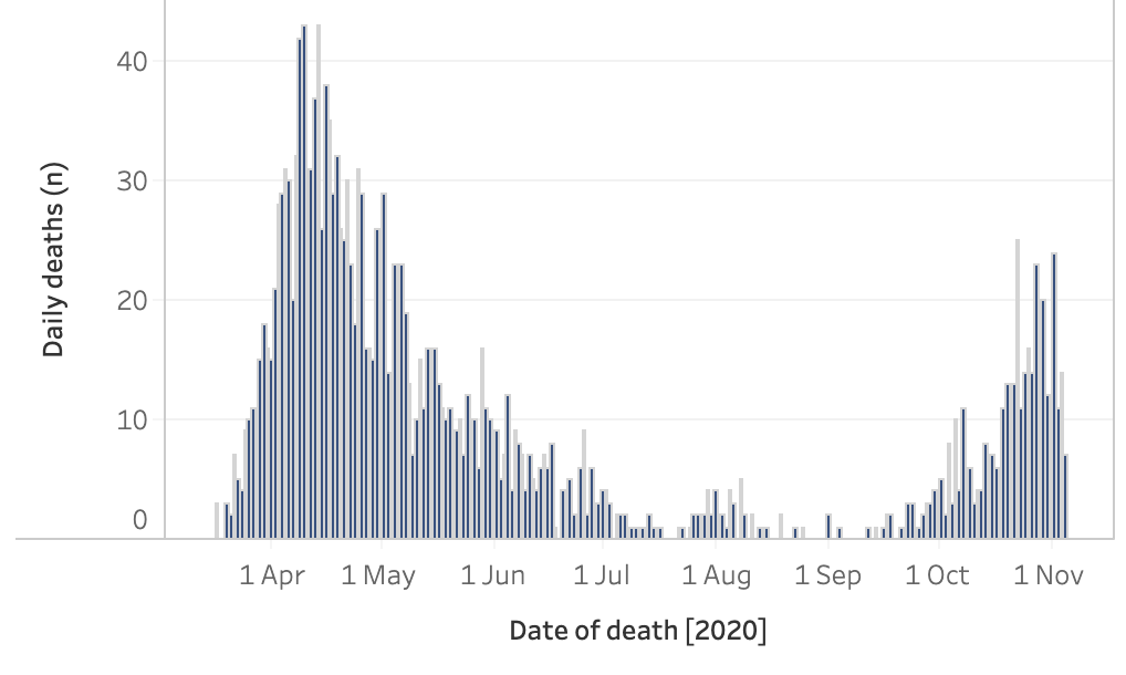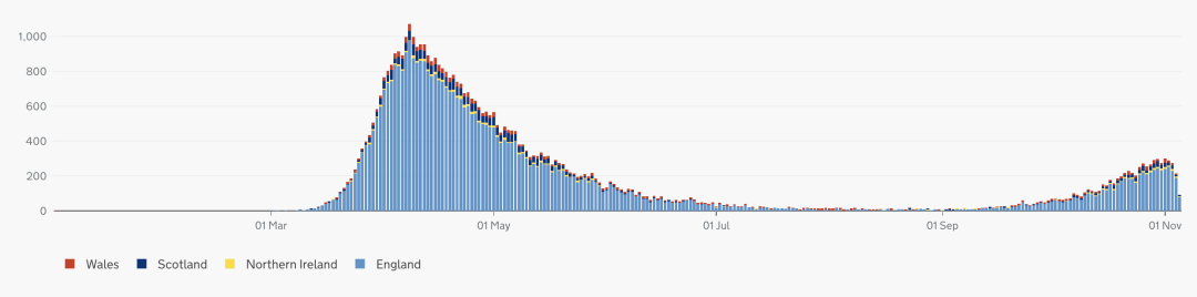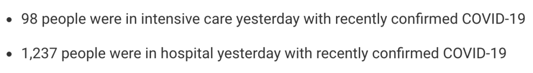 从3月5日以来,苏格兰地区一共有6,107名(+77)确诊患者出院。截至11月6日午夜,近期住院的疑似/确诊新冠患者共1,237名(-15),其中98名(+3)确诊新冠在重症监护室ICU。