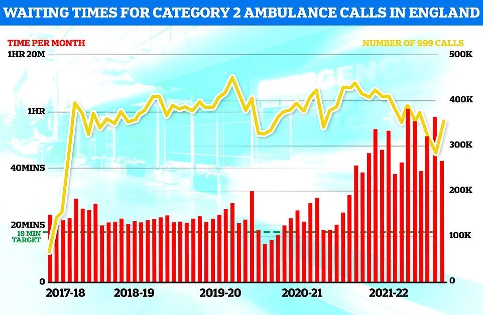 尽管等待名单仍在变长,但救护车的等待时间略有改善。然而,一名呼叫救护车的心脏病患者需要平均等待43分钟,是目标时间的两倍。