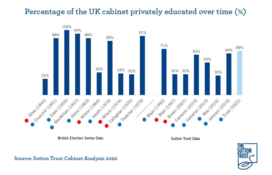 在特拉斯内阁的31名部长中,35%的人毕业于牛津或剑桥大学,而英国人口中这一比例不到1%。