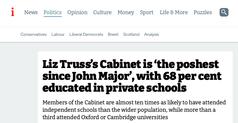 特拉斯Liz Truss已经完成内阁组建,该届内阁被称为自1990年11月John Major政府以来的“最豪华内阁”——68%在私立学校接受教育,三分之一成员毕业于牛津或剑桥大学。