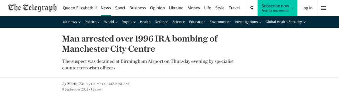 一名男子因涉嫌恐怖犯罪,于9月8日在伯明翰机场被拘留,他被怀疑与1996年爱尔兰共和军IRA在曼彻斯特市中心实施的爆炸案有关。