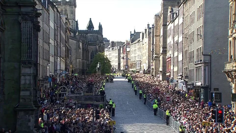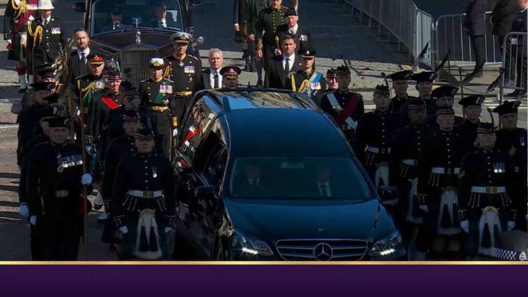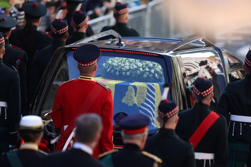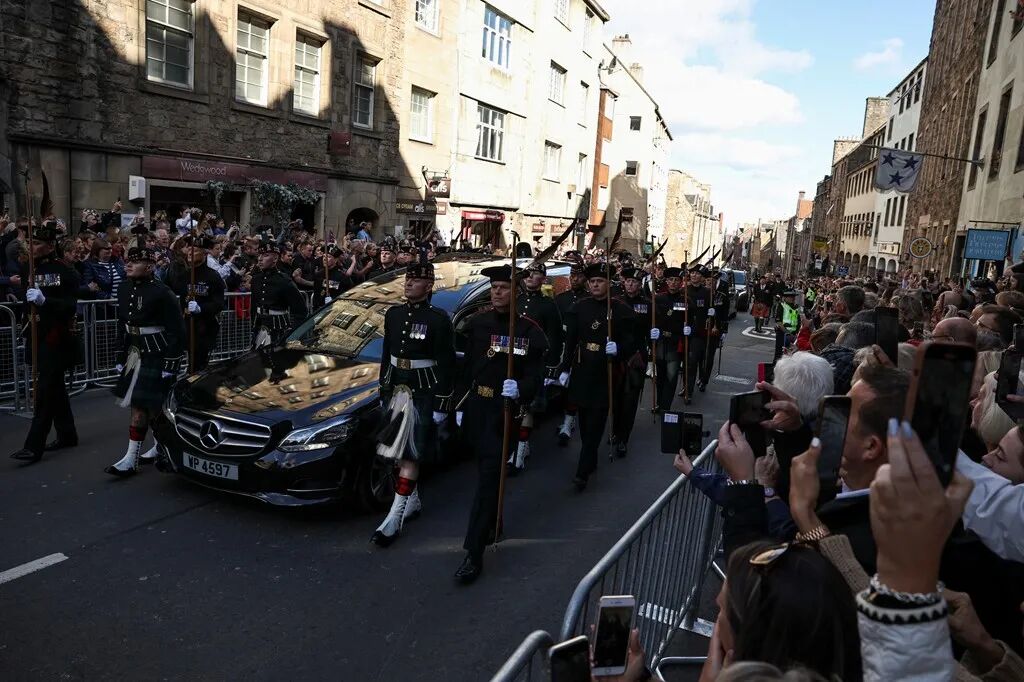 下午14时25分左右,皇家卫队抬着伊丽莎白二世女王的灵柩上车,将沿皇家大道Royal Mile抵达圣吉勒斯大教堂,游行正式开始。
