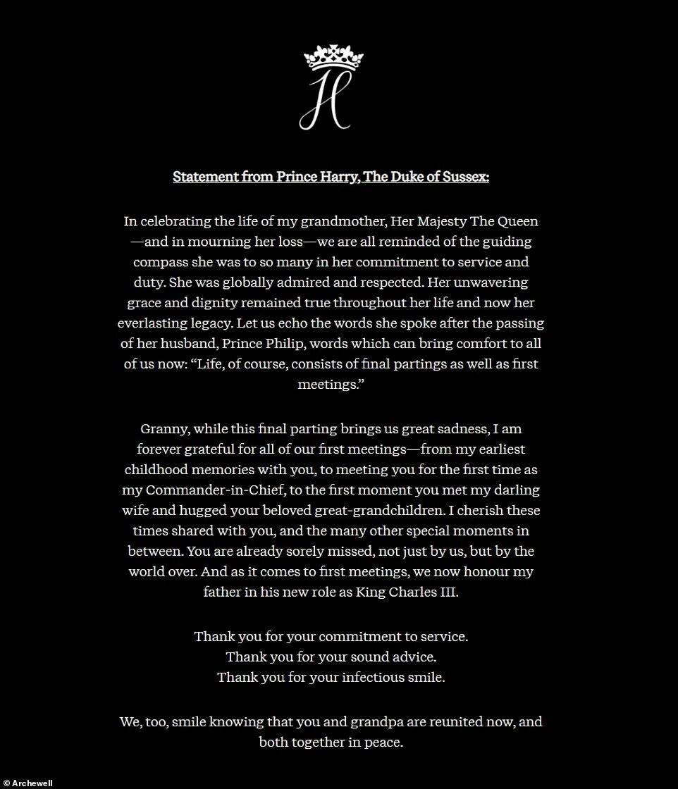 哈里王子向他亲爱的奶奶伊丽莎白二世表达了“感人的敬意”。在公布的一封信中,哈里说道:“奶奶现在与爷爷团聚”了,将“微笑着和平地永远在一起”。