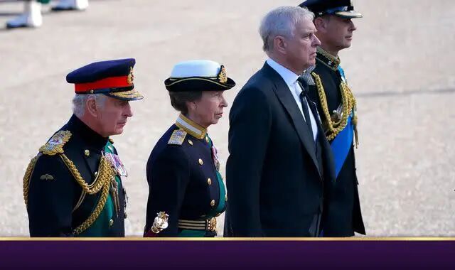 由国王查尔斯三世带领安德鲁王子、爱德华王子、安妮公主和她的丈夫海军副司令Tim Laurence爵士步行,走在存放女王灵柩的灵车之后。王妃和伯爵夫人乘车跟随。