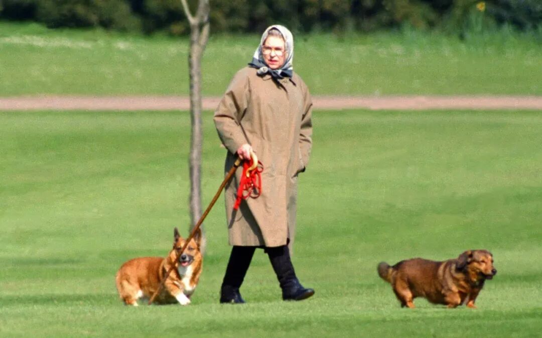 在疫情期间,女王经常带着两只柯基犬在温莎城堡附近的公园散步。