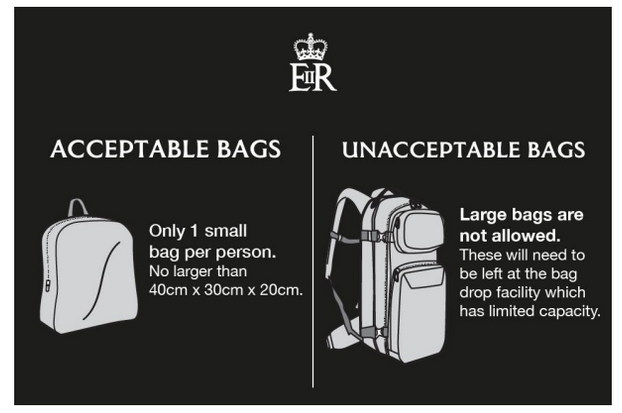 包括折叠椅、睡袋、行李箱、锤子、香烟、哨子、相机和旗帜等物品将被没收。鲜花和其他如蜡烛、软玩具和照片在内的纪念品也不允许携带。
