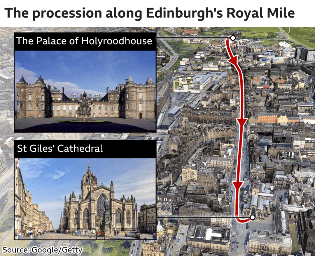女王灵柩将在9月12日(周一)存放于荷里路德宫,并于当日下午移至圣吉尔斯大教堂。英国国王查尔斯三世和王妃卡米拉将前往爱丁堡,参加灵柩移置游行。