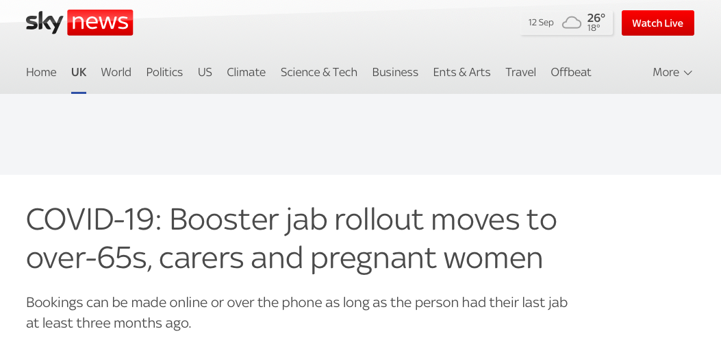 自上周起,NHS已经开始向75岁及以上人群、临床免疫脆弱者和一线卫生和护理工作者接种加强剂。