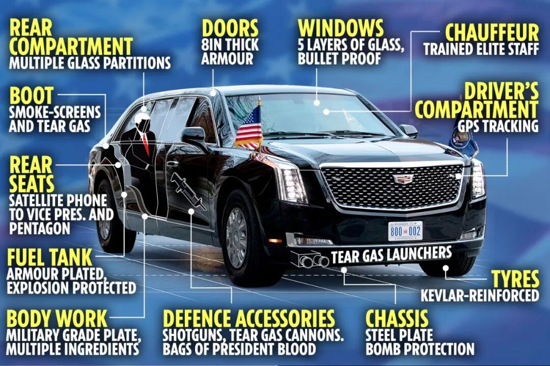 据介绍,拜登的防弹座驾重约两万磅,配有夜视摄像头、催泪瓦斯、20厘米厚的装甲以及7.6厘米厚的窗户,其车门和波音757的机舱门一样重。