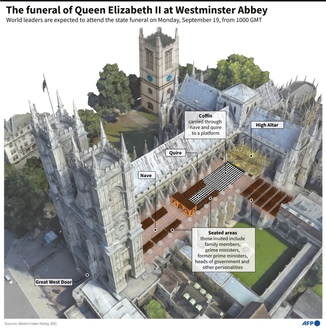 伊丽莎白二世女王的葬礼将于9月19日(周一)上午11时在威斯敏斯特教堂举行,该场地可容纳2,000人。