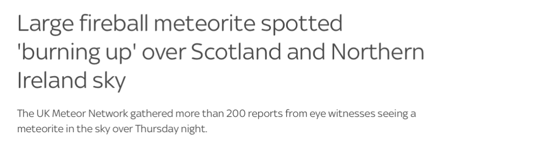 据悉,英国流星网收到了200多份报告称,苏格兰和北爱尔兰夜空出现了神秘“流星”,少数报告来自英格兰地区。国际流星组织也收到了从英国和爱尔兰各地发出的近800份目击报告。
