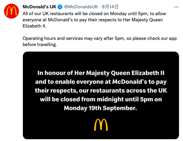 快餐连锁店麦当劳在其社交媒体上发布的声明称,“为了纪念英国女王伊丽莎白二世,并使麦当劳的每个人都能表达他们的敬意,我们在英国的餐厅将从9月19日(周一)的午夜至下午5点关闭”。