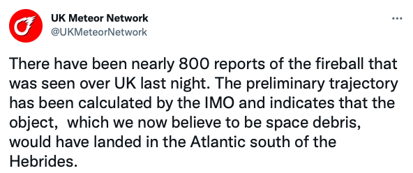 按照@UKMeteorNetwork的说法,”国际海事组织已计算出初步轨迹,并表明该物体(我们现在认为是空间碎片)将降落在赫布里底群岛以南的大西洋“。