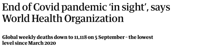 根据世界卫生组织网站数据,截至2022年9月5日,全球每周死亡人数为11,118人,达到2020年3月以来最低水平。2020年3月也是英国首次进入全国封锁状态的月份。