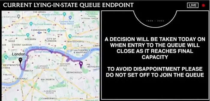 于此同时,由于女王灵柩瞻仰仪式将于9月19日早6时结束,文化部门在一份声明中说,“随着排队人数达到容量上限,将随时决定停止排队”。目前的排队等候的时间估计为13个小时。