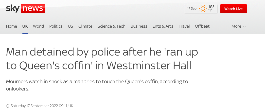 另一名目击者称,“该男子突然从排队队伍中冲出,将一名七岁的女孩推开,跑到女王灵柩前,试图做些什么。但警察在两秒钟内就抓住了他“。