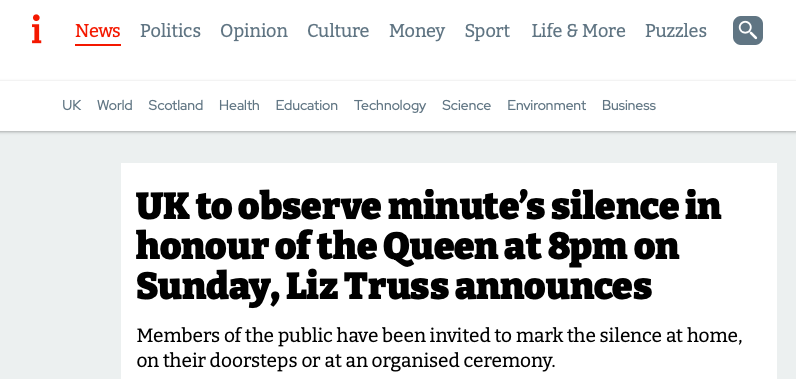唐宁街10号的官方发言人表示,9月18日(周日)晚20:00,英国各地将为女王进行一分钟的默哀,这也是女王去世以来第一次举行全国性默哀。
