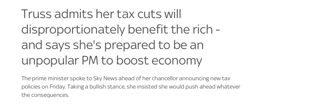 英国首相特拉斯Liz Truss在9月23日(周五)颁布新税收政策前接受了天空新闻SkyNews的采访,她表示,已经准备好在税收政策方面“不受公众欢迎”的准备,并将以“不受欢迎的首相身份“促进英国经济发展。