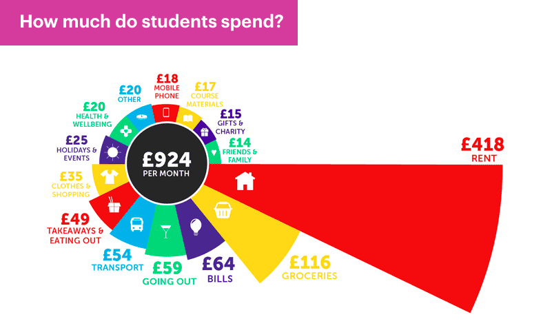调查发现,大学生的日常生活费用同比增长了14%,平均月支出为£924,对于伦敦就读学位的学生来说,则为£1,089。