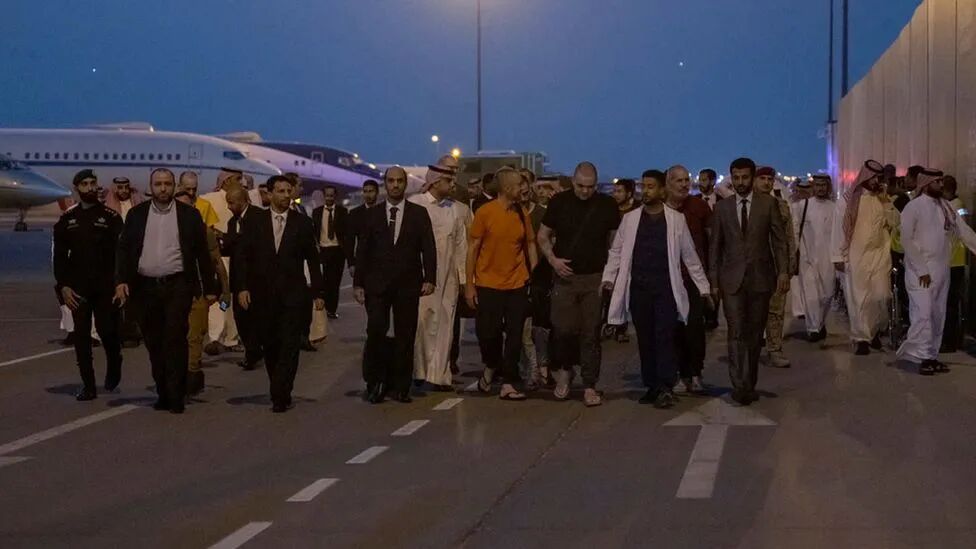 发布的照片显示,在乌克兰作战被俘的Aiden Aslin、John Harding和Shaun Pinner在沙特阿拉伯利雅得下飞机时,似乎有沙特官员陪同。