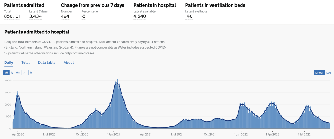 9月15日数据:目前住院的确诊新冠患者4,540人,累计住院新冠患者总数为850,101(+3,434)。