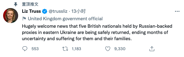 英国首相特拉斯Liz Truss在社交媒体上确认了这一消息,“终于结束了他们本身以及他们的家人几个月以来的不确定和痛苦”。