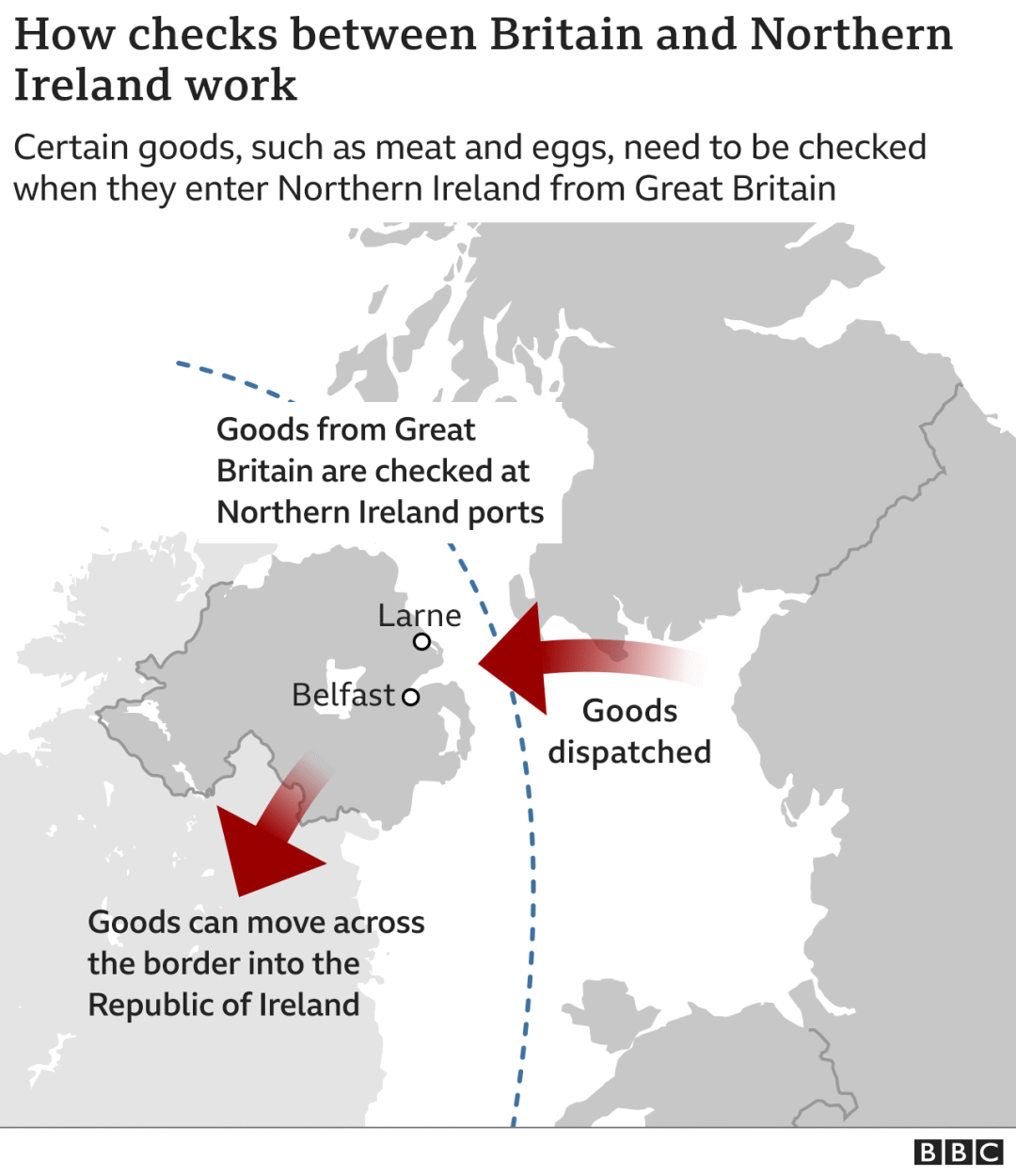 《北爱尔兰议定书》是英国脱欧协议的一部分,具体争议内容为:卡车在从北爱尔兰(英国境内)前往爱尔兰共和国(欧盟境内)时无需通过检查站。但当货物从英国其他地区(英格兰、苏格兰和威尔士)抵达北爱尔兰时,将根据欧盟规则进行检查。