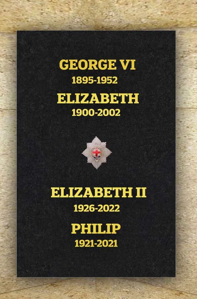 石碑上写着“乔治六世1895-1952”(George VI 1895-1952)和”伊丽莎白1900-2002”(Elizabeth 1900-2002);“伊丽莎白二世1926-2022”(Elizabeth II 1926-2022)和“菲利普1921-2021”(Philip 1921-2021),中间装饰着嘉德骑士团的徽章。
