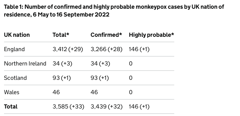 截至9月16日,英国确诊猴痘病例和记录高度疑似病例共3,585例;伦敦地区占69%(2,359例)。9月以来,平均每日仅有不到15例新增病例。