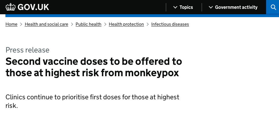 截至9月20日,英国超过45,000人已经接受了一剂天花疫苗,其中包括超过40,000名同性恋、双性恋和其他男男性行为者。