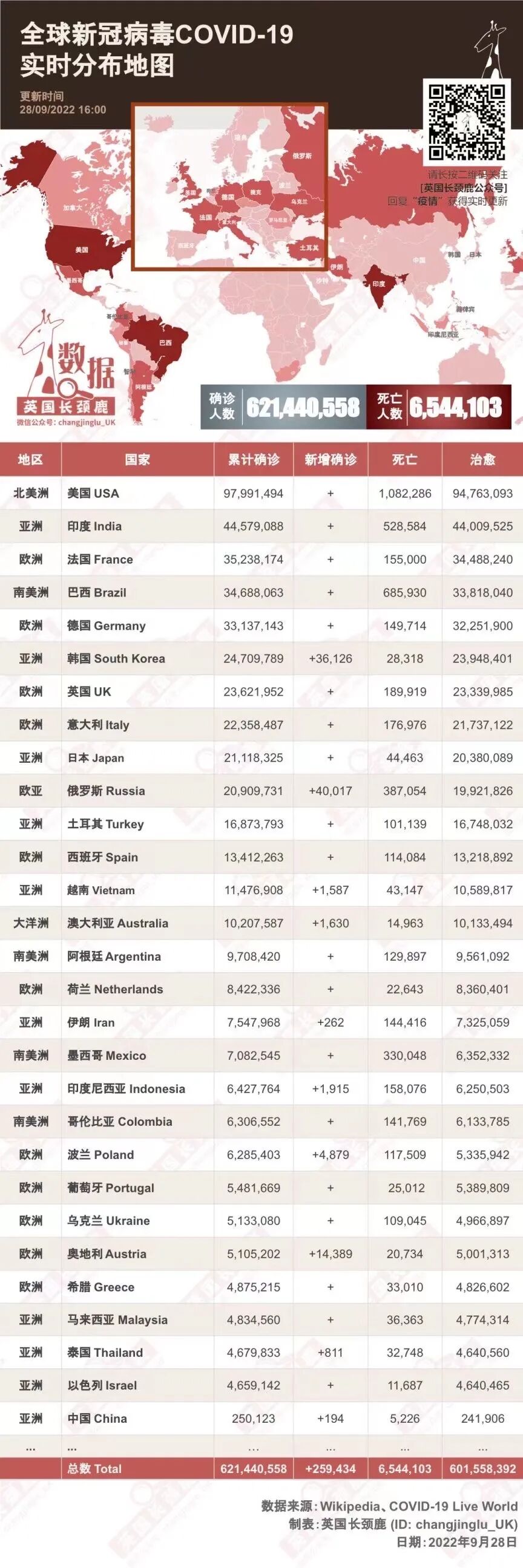 截止至2022年9月28日(周三)英国时间09:00,累计检测结果量514,605,757(待更新);累计确诊23,621,952例(待更新);累计病亡189,919(待更新)。
