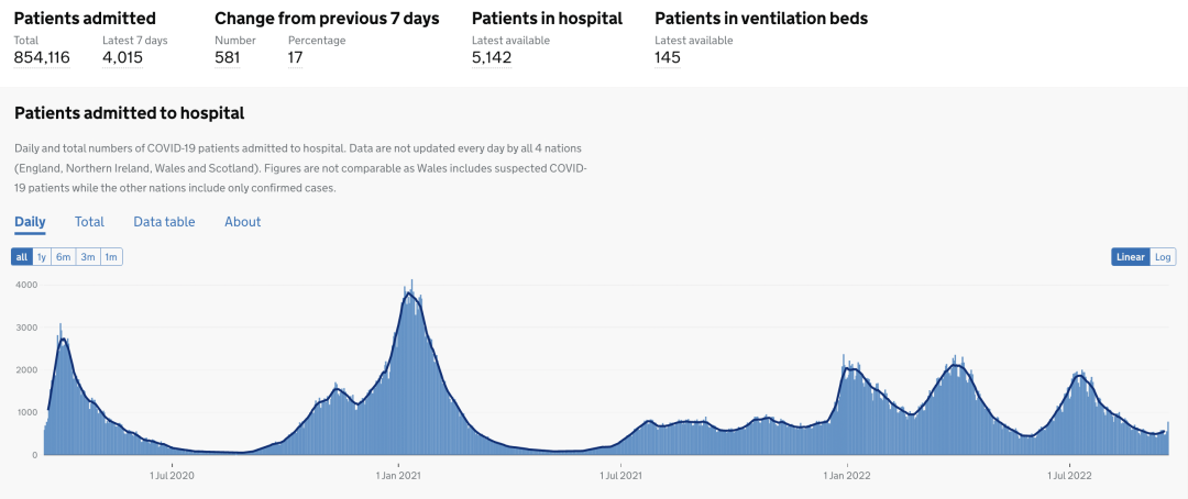 9月22日数据:目前住院的确诊新冠患者5,142人,累计住院新冠患者总数为854,116(+4,015)。