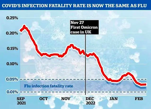 根据英国《每日邮报》(Daily Mail)在今年3月的报道,基于Omicron变种感染后的温和性和人口对新冠的免疫率提升,新冠病毒当时在英国的致死率已低于流感。