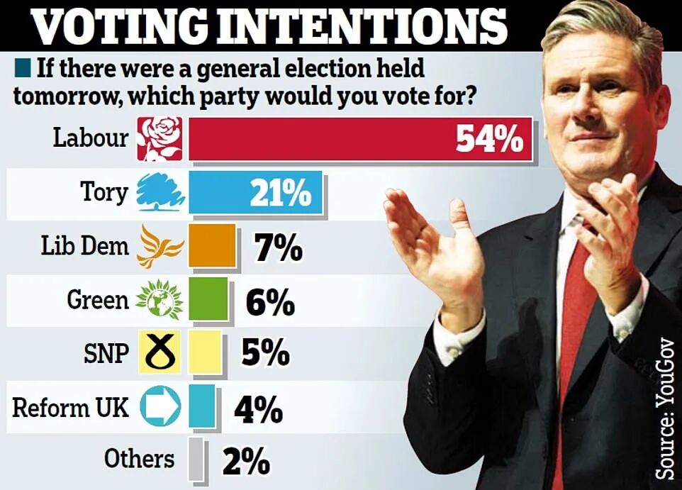 该调查显示,54%的选民意向在下一次大选中支持工党,只有21%的选民支持保守党,使得工党的领先扩大到创纪录的33%。自由民主党下降至7%,绿党为6%。