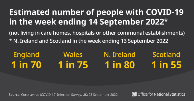 在截至9月14日的一周内,英格兰共有766,500人报告感染新冠,大约为每70人中有1人感染。