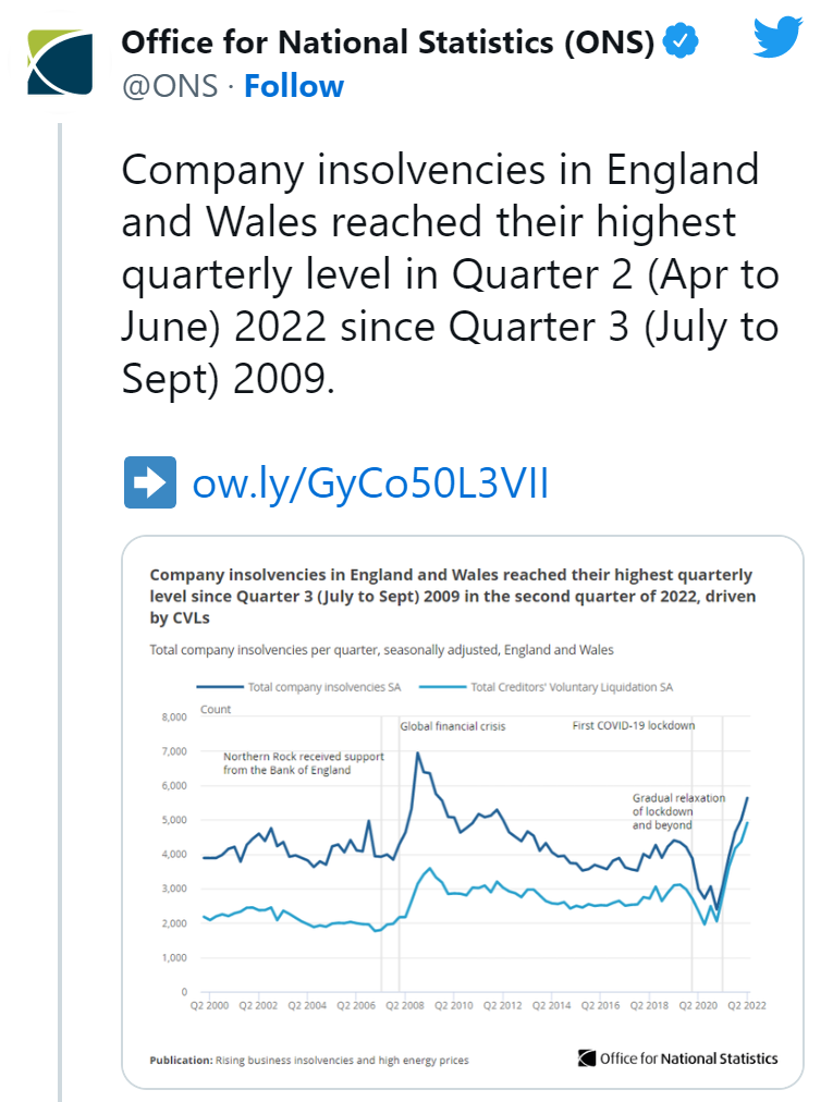 10月7日(周五),英国国家统计局ONS的数据显示,因能源价格飙升对企业造成了巨大损失,英格兰和威尔士的公司破产数量在4月-6月期间达到了自2009年第三季度以来的最高季度水平。