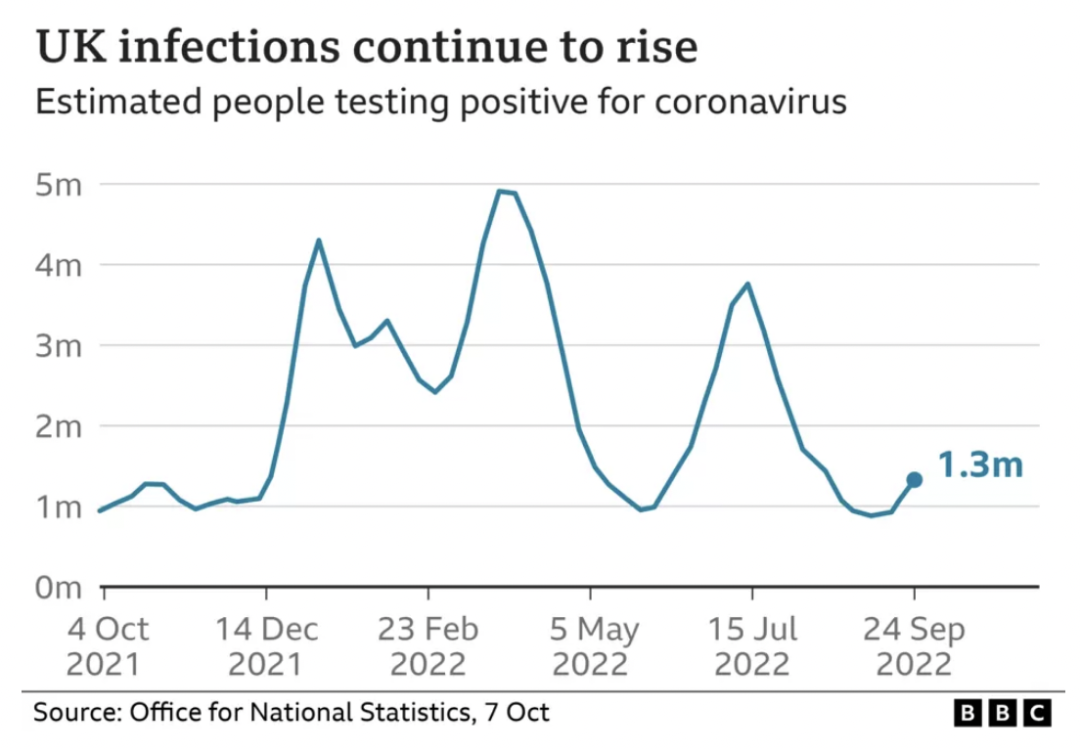 紧随其后的是盖茨黑德、北萨默塞特、怀特岛、诺森伯兰、多塞特和约克,以上地区的感染率大约每10万人中有124~141人确诊。同时,在截至10月5日(周三)的一周内,英格兰的新冠确诊人比前七天增加了37%,是两个月以来的最高数字。而真正的数字可能是确诊数字的5~10倍。(因为从8月31日起,NHS无症状检测就暂停了)其次,在西南地区,自9月中旬以来,入院率已经飙升了250%,在最近一周上升到每10万人中有16人住院。该地区目前有1003名患者检测呈阳性,接近今年夏天由奥密克戎BA.4和BA.5亚变体驱动的感染浪潮中的峰值,在7月中旬该浪潮导致全国住院人数超过14000人。另外,最新的数据显示,英格兰所有地区的新冠确诊人数都在稳步上升,有三个地区甚至回到了7月下旬的水平。但是,这三个地区的确诊率仍然大大低于大流行病高峰时期水平。