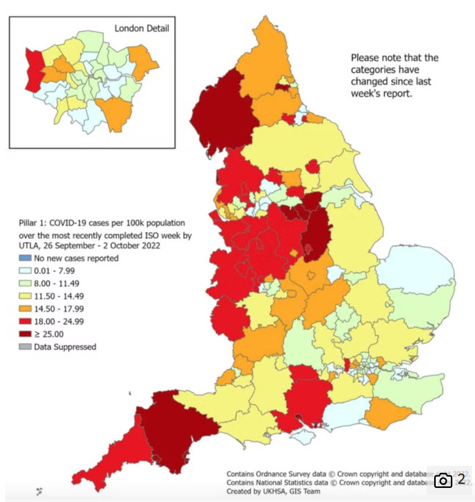 以下是截止至10月1日的这一周,UKHSA英国卫生局公布的英国感染率最高的20个地区(病例数-感染率/每10万人):